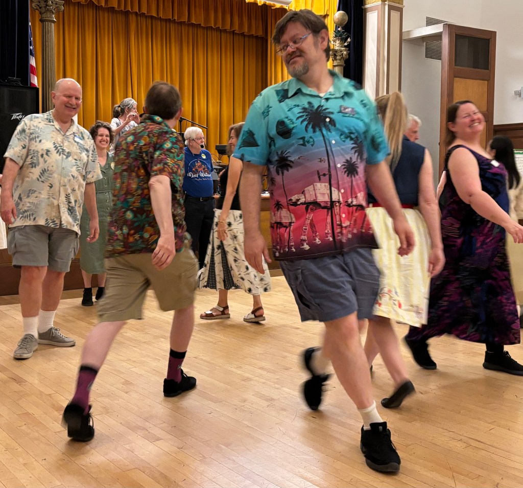 Typically, a dancer has a different partner for each dance (though in a few dances one has no partner, and in some one has multiple partners). A set will be made up of multiple pairs of partners, which means that everyone ends up dancing with everyone in the room in some way…it’s very social! It’s a very comfortable sort of dancing for folks who come solo, because everyone dances with everyone.