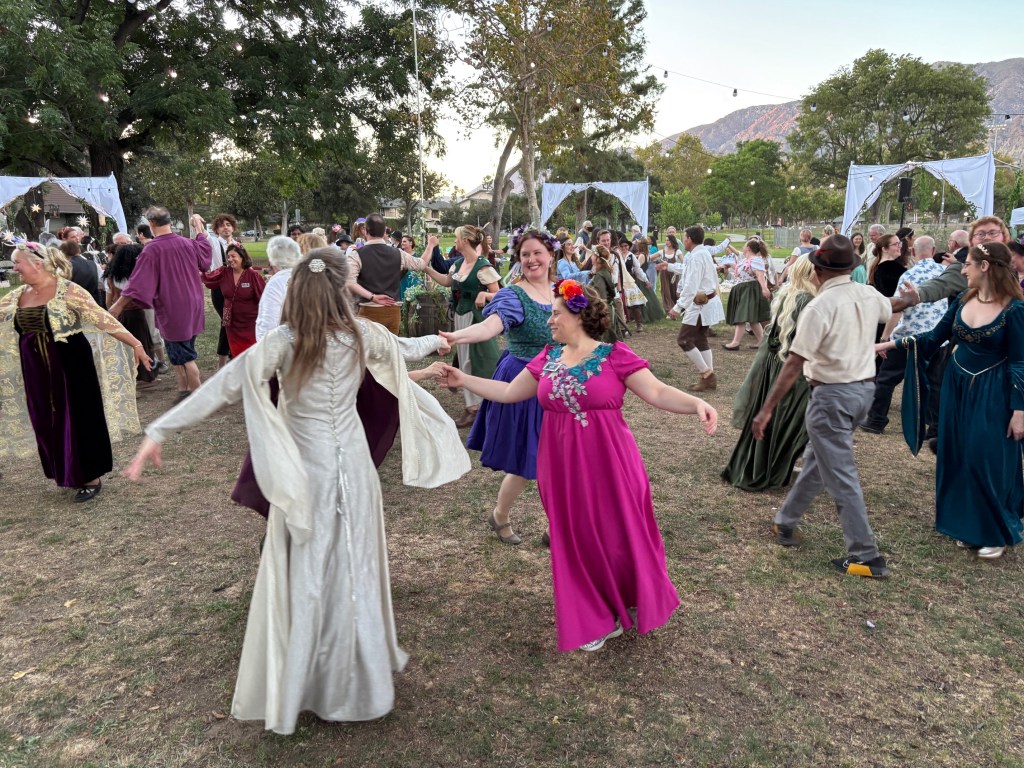 Typically, each English country dance has its own tune (which can be slow, fast, or in-between; lyrical or rowdy or wistful….or pretty much anything else that music can express!) A typical evening will have perhaps 7 – 12 different dances done, and at most ECD groups, each dance is individually taught, walked through, and prompted by a caller. After the teaching and walkthrough, each dance will generally take about 3 – 15 minutes to dance (depending on the dance, the size of the room, etc).